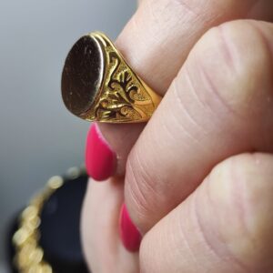 Anello da Uomo tondo Liscio, in oro 18 K, intarsiato. Dimensioni parte superiore 1,1 cm x 1,6 cm. Peso circa 7,90 grammi.