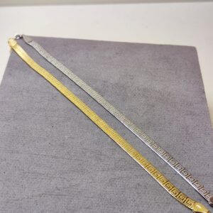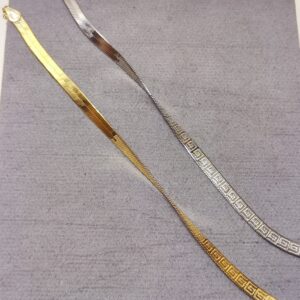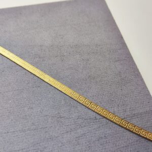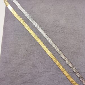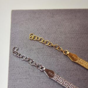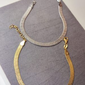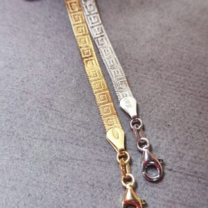Bracciale con Greca Modello Piattina in Argento 925. Disponibile sia in Argento Silver, sia in Argento Dorato. La lunghezza è 17 cm e arriva a 20 cm con la catenina. Lo spessore è 5mm. Il peso è circa 4 grammi.