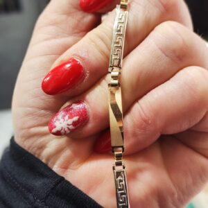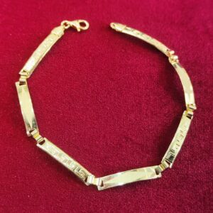 Il bracciale è lungo 20,5 cm e spesso 4 mm. Sulle piastre  è incisa la Greca Il peso è circa 3,50 grammi.