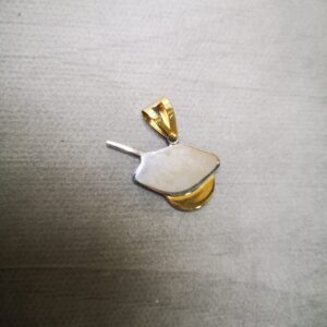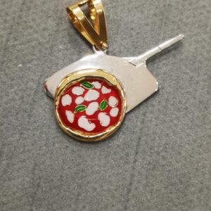 Ciondolo in oro 18K a forma di pizza in oro giallo, con pala in oro bianco. Peso totale circa 5,50 grammi. La dimensione totale del ciondolo è 2,5 cm compreso di gancio, 1,8 cm senza gancio, il diametro della pizza è circa 1,3 cm.