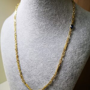 Collana Modello Rudy in oro giallo 18K, lunga 50 cm e spessa circa 5 mm. Il peso è circa 6.80 grammi. Chiusura di sicurezza a molla in oro giallo 18K, con pietra blu.