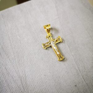 Crocifisso a due colori in oro 18K, con spazio al centro come si vede in foto. Le dimensioni sono 3cm per 2 cm, 2mm circa di spessore, più gancio di circa 1cm. Il peso è circa 2,5 grammi.