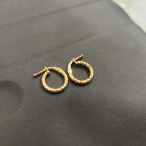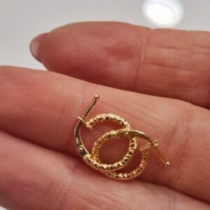 Orecchini a cerchieto intarsiati piccoli in oro 18K. Il diametro è circa 1.2 cm, la larghezza circa 2 mm.