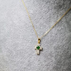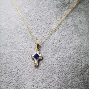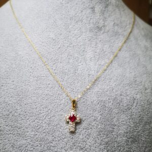 La Collana è lunga 45cm. Il ciondolo è circa 1 cm e porta una pietra zircone al centro della croce e tanti piccoli zirconi bianchi intorno.