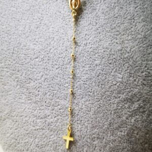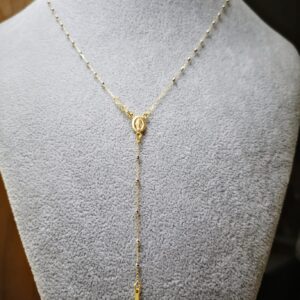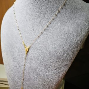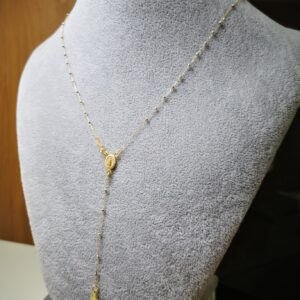 Rosario in due colori, oro giallo e bianco 18K, Lunghezza 50 cm, più pendente lungo 8cm compreso di croce all’estremità. Ovale con madonnina in rilievo. I grani hanno un diametro di 1 mm, e ci sono 8mm di catenina tra un granulo e l’altro. Chiusura di sicurezza a molla anti apertura accidentale. Peso totale circa 3 grammi.