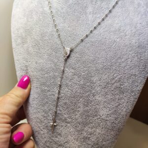 Collana Rosario in argento 925 con grani lisci dello spessore di circa 1mm. La lunghezza è 45 cm + 9 cm il pendente. Il peso è circa 4,50 grammi.