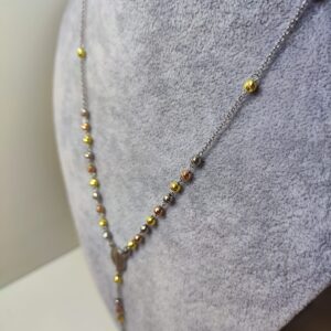 Collana Rosario in argento 925 in tre colori con grani satinati dello spessore di circa 4mm. La lunghezza è 55 cm e arriva a 60 con la catenina. Il peso è circa 9 grammi.