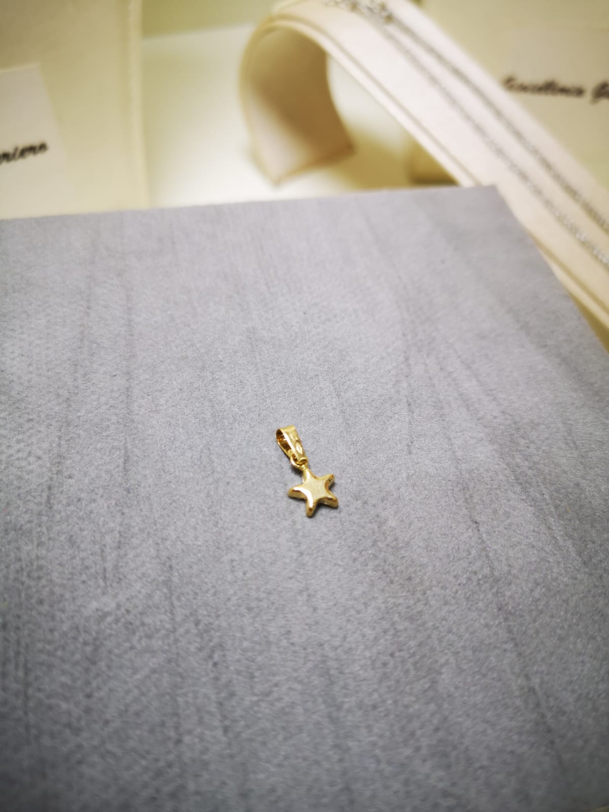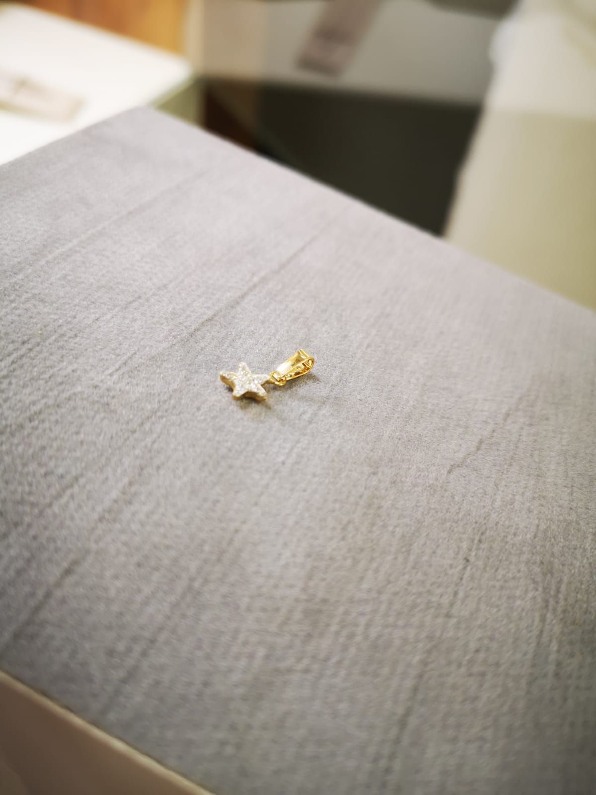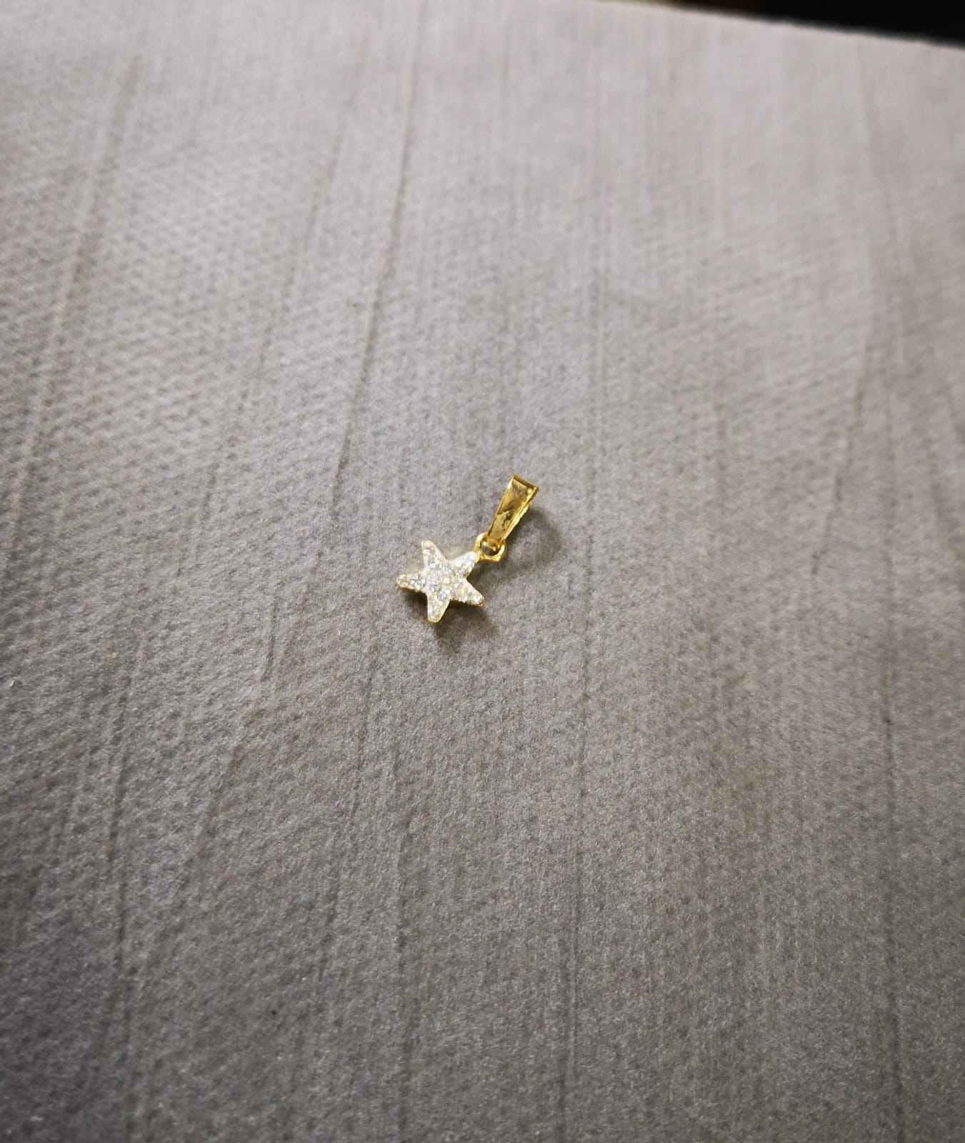 Ciondolo a forma di stellina ricoperta di zirconi bianchi. Le dimensioni della stellina sono circa 8mm per 8mm. Il peso è circa mezzo grammo.